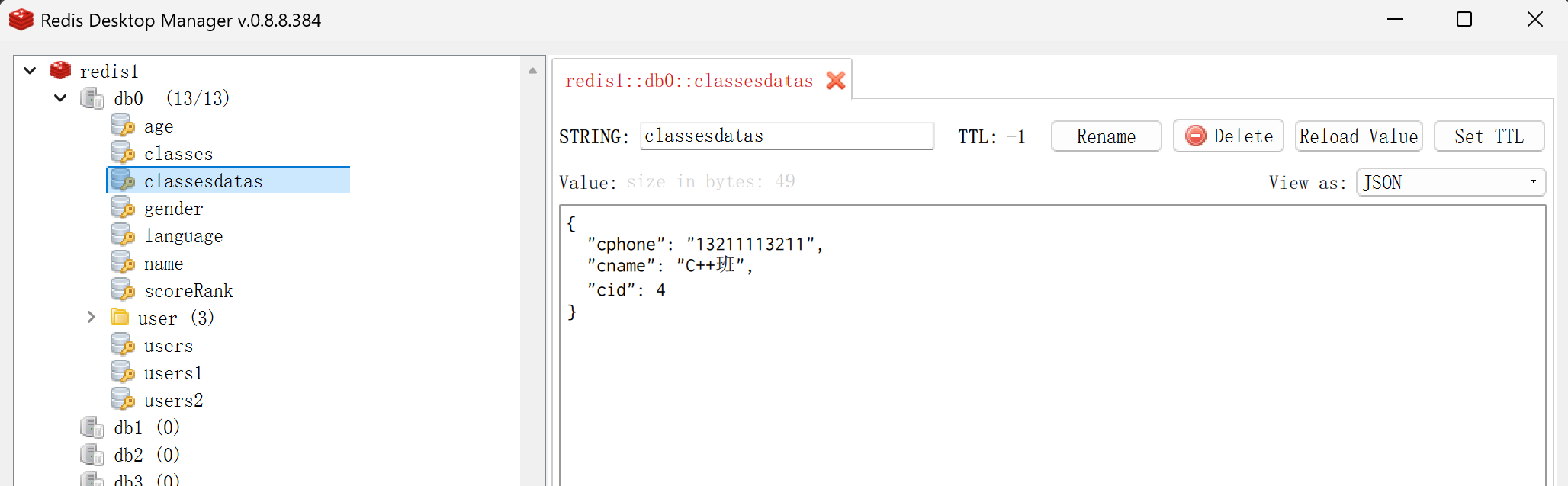 100,Java班,13800138000); - Redis 控制台显示缓存成功,MySQL 控制台显示插入成功,可查询数据库验证数据。