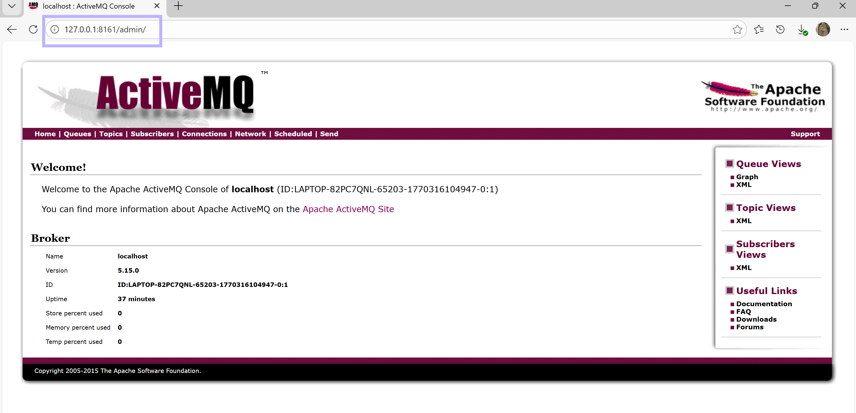 ⑤ 运行成功后,在浏览器中访问网址: http://127.0.0.1:8161/admin/
