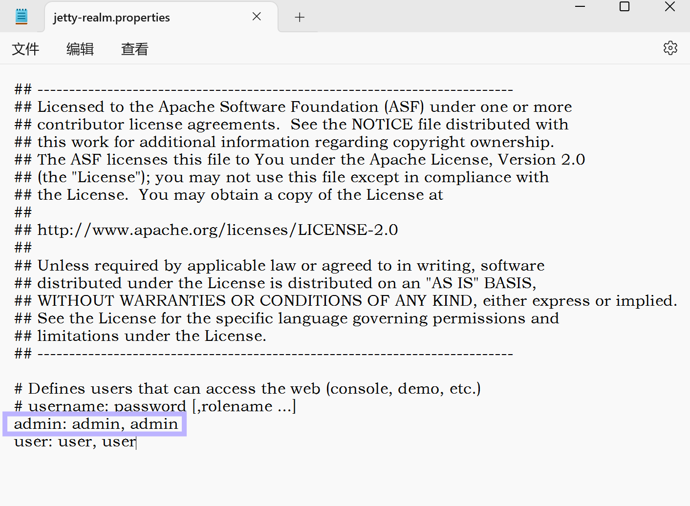 ① 若要修改密码,找到 jetty-realm.properties 文件,右击选择记事本方式打开