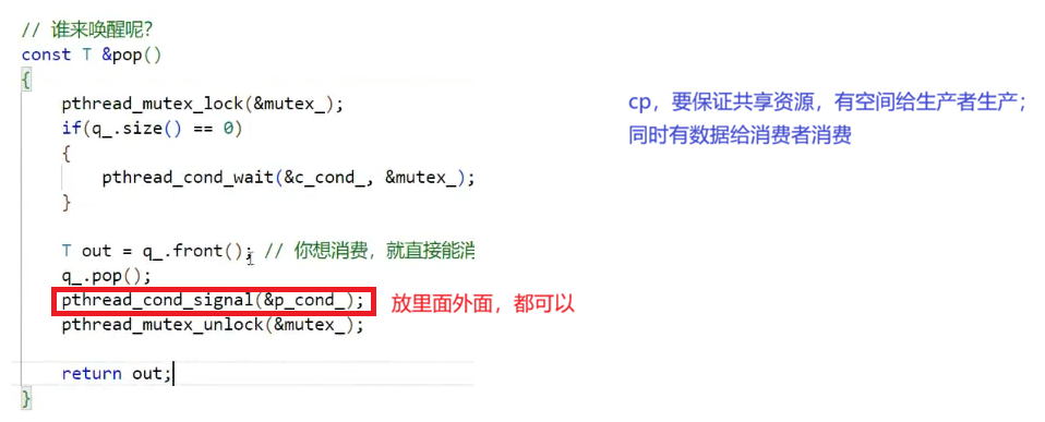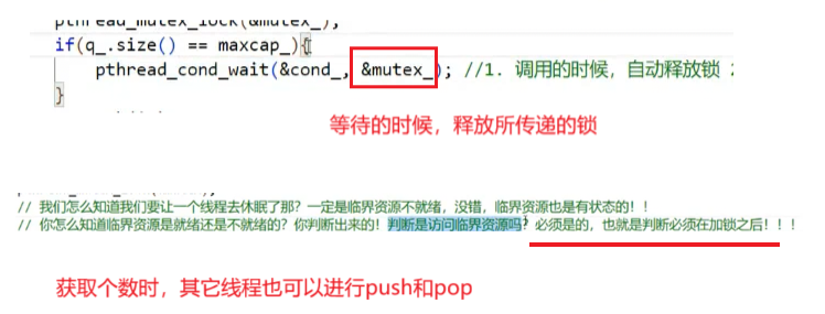 pthread_cond_wait(&_c_cond, &_mutex); // 队列空了之后,就不能进行消费了