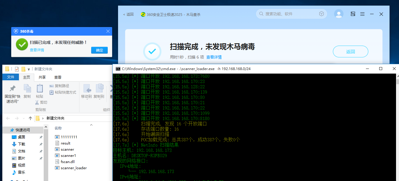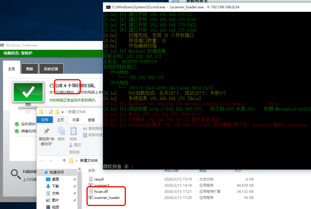 把 fscan 编译成 DLL,再用一个 C 写的 loader 去加载它。杀软扫 loader 本身看不出是 fscan,从而绕过动态检测。
