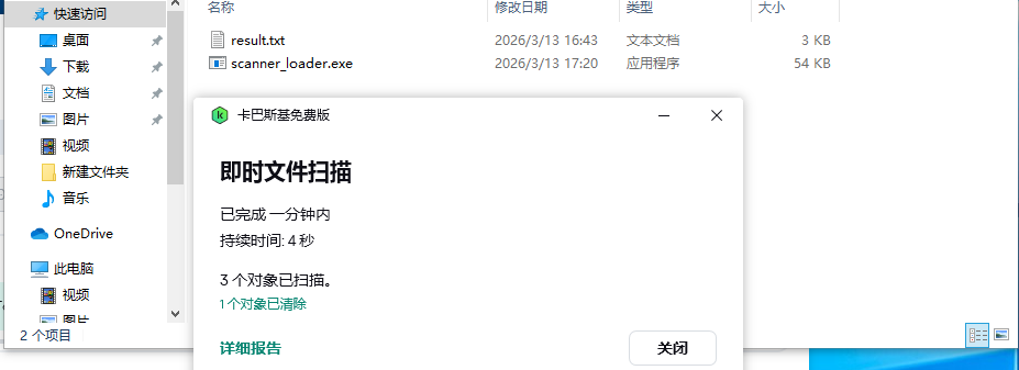 💡 卡巴删的是 DLL,说明检测的是 DLL 内的 POC 行为特征,不是 loader。进一步绕过方向:内存加载 DLL(后续文章)。