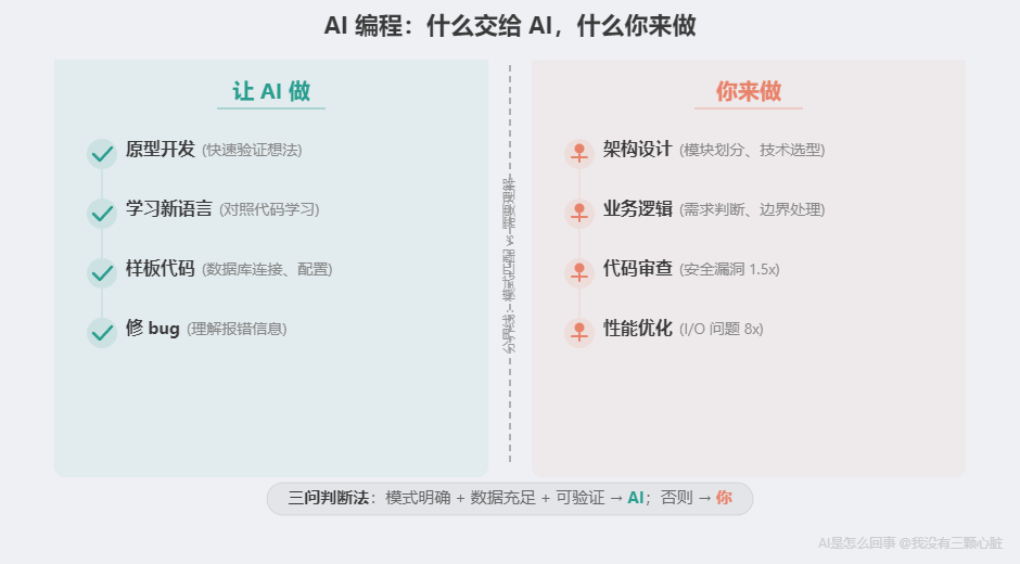 分界线在哪?就是三问判断法。 模式明确、数据充足、可验证的部分交给 AI;需要理解具体场景、做独特判断的部分,你来。