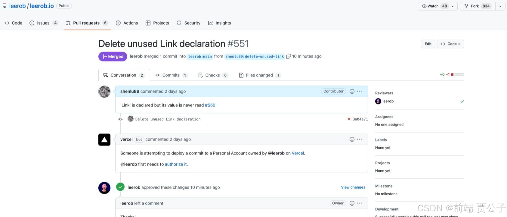 来到原项目 Github 主页,找到之前已经合并的提交请求(在关闭的 PR 列表中),点击 Delete branch
