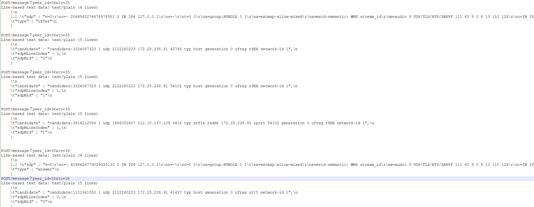 ...\] \\t"sdp" : "v=0\\r\\no=- 2564865274678976581 2 IN IP4 127.0.0.1\\r\\ns=-\\r\\nt=0 0\\r\\na=group:BUNDLE 0 1\\r\\na=extmap-allow-mixed\\r\\na=msid-semantic: WMS stream_id\\r\\nm=audio 9 UDP/TLS/RTP/SAVPF 111 63 9 0 8 13 110 126\\r\\nc=IN IP4 0.0.0.0\\r \\t"type" : "offer"\\n } POST/message?peer_id=36\&to=35 Line-based text data: text/plain (5 lines) {\\n \\t"candidate" : "candidate:3324087323 1 udp 2122260223 172.25.238.91 42768 typ host generation 0 ufrag r9EX network-id 1",\\n \\t"sdpMLineIndex" : 0,\\n \\t"sdpMid" : "0"\\n } POST/message?peer_id=36\&to=35 Line-based text data: text/plain (5 lines) {\\n \\t"candidate" : "candidate:3324087323 1 udp 2122260223 172.25.238.91 54102 typ host generation 0 ufrag r9EX network-id 1",\\n \\t"sdpMLineIndex" : 1,\\n \\t"sdpMid" : "1"\\n } POST/message?peer_id=36\&to=35 Line-based text data: text/plain (5 lines) {\\n \\t"candidate" : "candidate:3814212593 1 udp 1686052607 112.10.137.109 6418 typ srflx raddr 172.25.238.91 rport 54102 generation 0 ufrag r9EX network-id 1",\\n \\t"sdpMLineIndex" : 1,\\n \\t"sdpMid" : "1"\\n } POST/message?peer_id=35\&to=36 Line-based text data: text/plain (4 lines) {\\n \[...\] \\t"sdp" : "v=0\\r\\no=- 4096626779029335130 2 IN IP4 127.0.0.1\\r\\ns=-\\r\\nt=0 0\\r\\na=group:BUNDLE 0 1\\r\\na=extmap-allow-mixed\\r\\na=msid-semantic: WMS stream_id\\r\\nm=audio 9 UDP/TLS/RTP/SAVPF 111 63 9 0 8 13 110 126\\r\\nc=IN IP4 0.0.0.0\\r \\t"type" : "answer"\\n } POST/message?peer_id=35\&to=36 Line-based text data: text/plain (5 lines) {\\n \\t"candidate" : "candidate:1101861550 1 udp 2122260223 172.25.238.91 41457 typ host generation 0 ufrag uY/5 network-id 1",\\n \\t"sdpMLineIndex" : 0,\\n \\t"sdpMid" : "0"\\n } toDO...