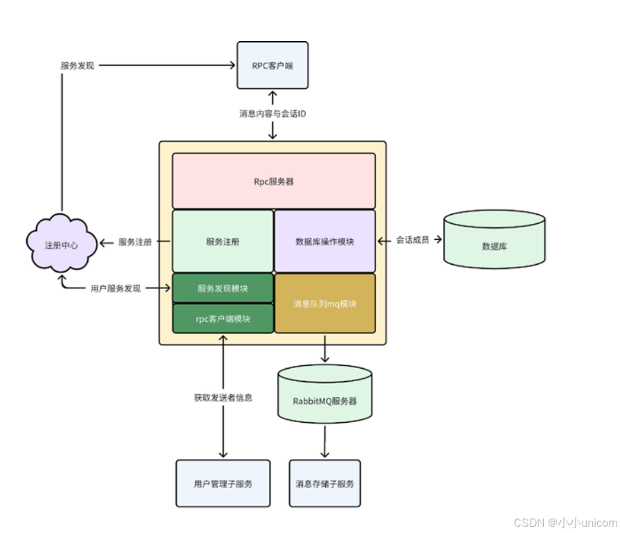 etcd框架与brpc框架封装的服务发现与调用模块,从用户子服务获取消息发送者的用户信息。 rpc服务模块:基于brpc框架搭建rpc服务器。MQ发布模块:基于rabbitmq-client封装的模块将消息发布到消息队列,让消息存储子服务进行消费,对消息进行存储。
