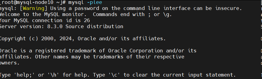 root@mysql-node3 \~\]# mysql -uroot -plee  ```bash mysql> CHANGE MASTER TO MASTER_HOST='172.25.254.10', MASTER_USER='repl', MASTER_PASSWORD='lee', MASTER_LOG_FILE='mysql-bin.000002', MASTER_LOG_POS=3201; mysql> start slave; mysql> SHOW SLAVE STATUS\G; ```  ### 测试: ```bash [root@mysql-node1 ~]# mysql -uroot -plee -e "INSERT INTO lee.userlist VALUES('user3','123');" ```  ```bash [root@mysql-node2 mysql]# mysql -uroot -plee -e 'select * from lee.userlist;' mysql: [Warning] Using a password on the command line interface can be insecure. ```  ```bash [root@mysql-node3 ~]# mysql -uroot -plee -e 'select * from lee.userlist;' ```