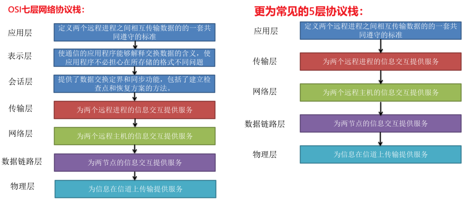 在OSI中,通常将网络划分成7个层次,但实际中我们会把最顶上的3层(应用层、表示层、会话层)统称为应用层,所以变为5层。网络协议栈是一个分层封装的结构,每一层都为上层提供服务,并添加头部信息。