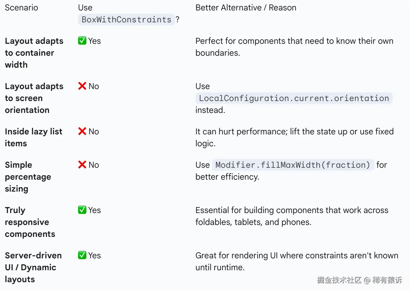 当你真正需要容器感知响应式布局 时,请使用它。如果更简单的修饰符就能满足需求,则应避免使用它。永远记住:它会带来额外的开销,因为它本质上与常规代码合成不同。