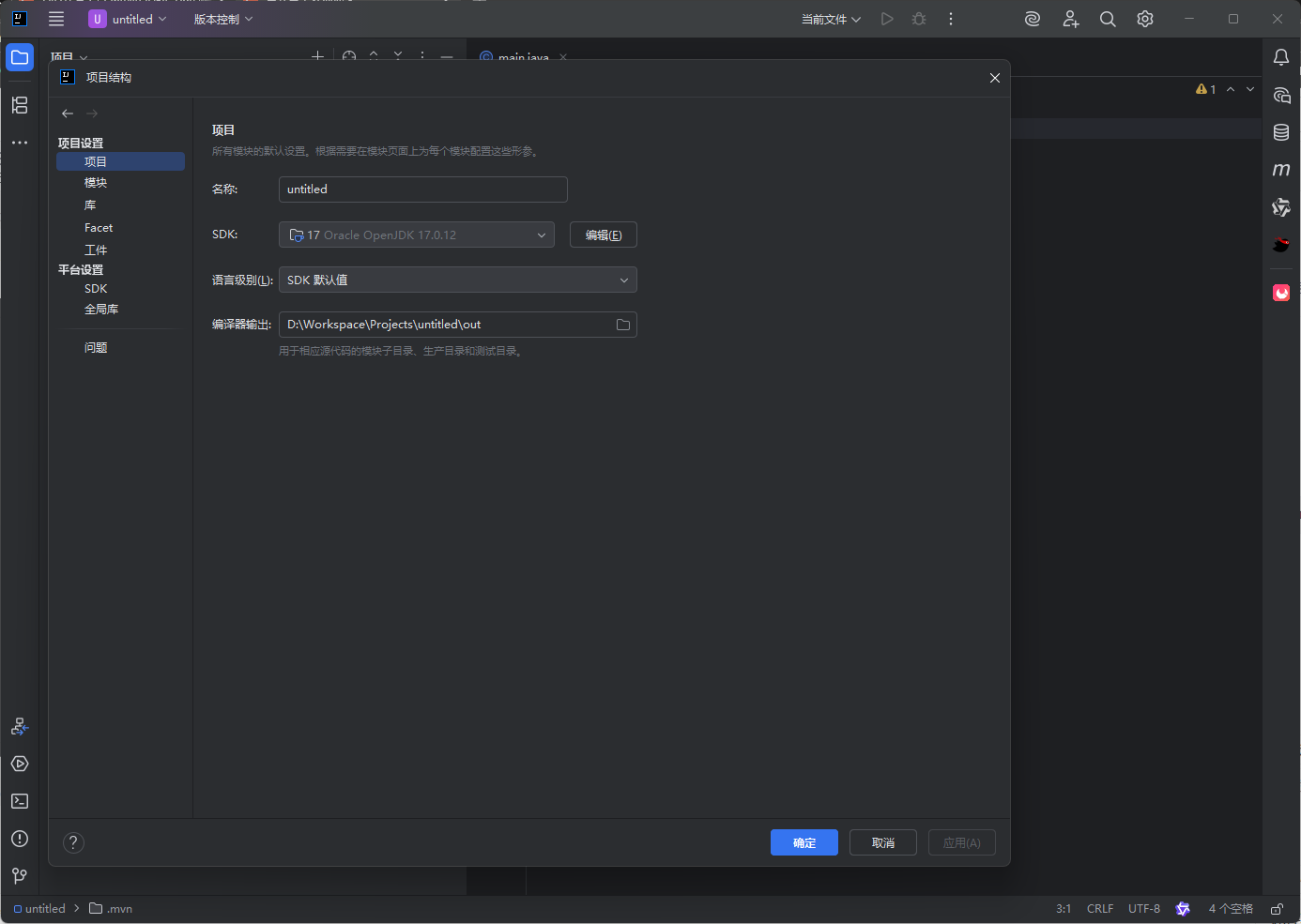 - 项目结构 (Ctrl+Alt+Shift+S): 打开当前项目的结构配置对话框。可以管理项目的SDK、库、模块、依赖项、 facets等。
