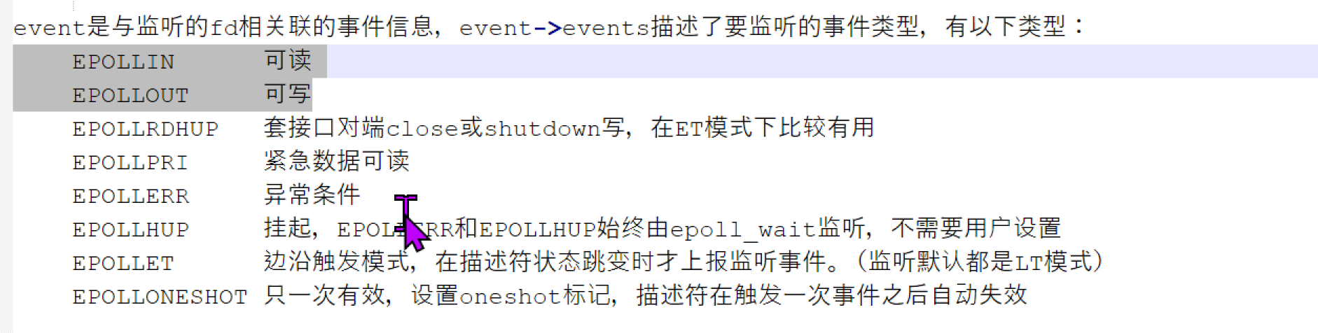 - events:表示获得就绪事件的一个结构体指针(理解为一个struct epoll_event类型的数组名)