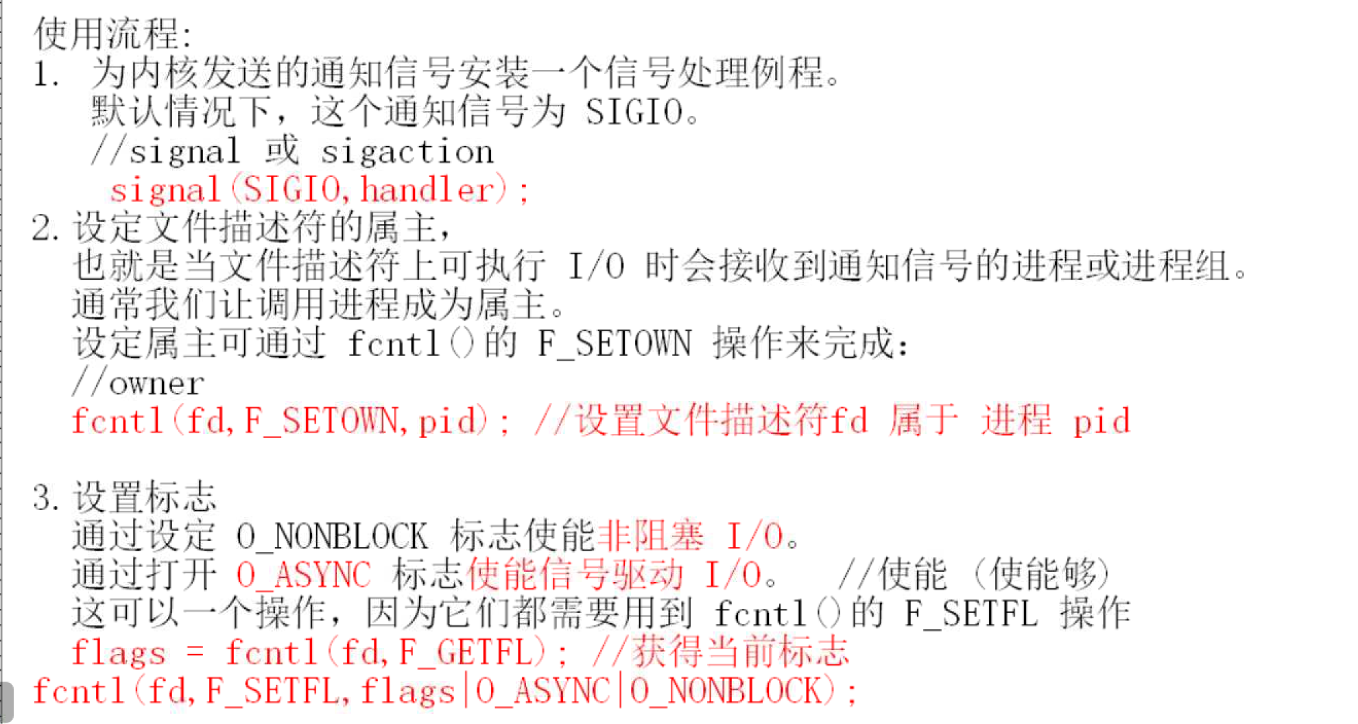 - 设置好对SIGIO的信号处理函数,等有数据来,内核会给进程发信号,进程收到信号后再去做读取操作