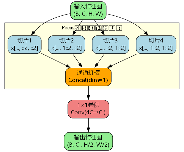Focus模块的核心思想是将空间维度的信息转换到通道维度,其操作可以用数学公式表示为: