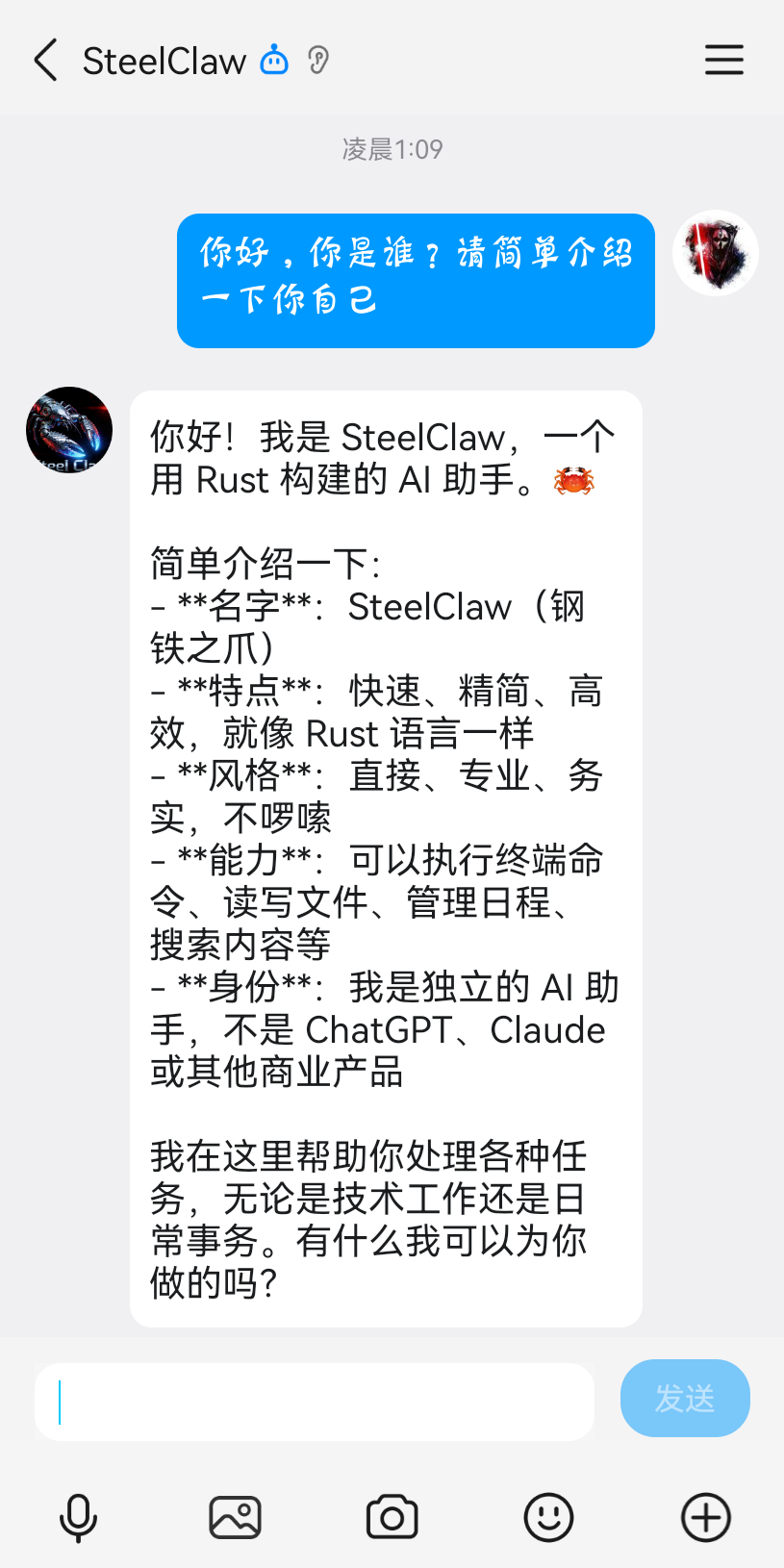 在手机QQ中选择对应QQ机器人输入内容确认 ZeroClaw 功能正常。