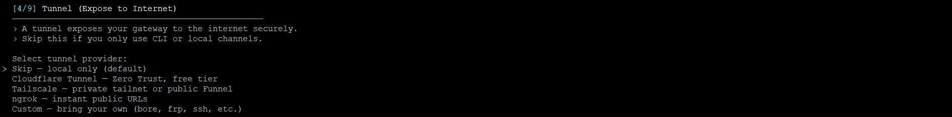 | 隧道 | Tunnel | None, Cloudflare, Tailscale, ngrok, Custom | 任意隧道工具 |
