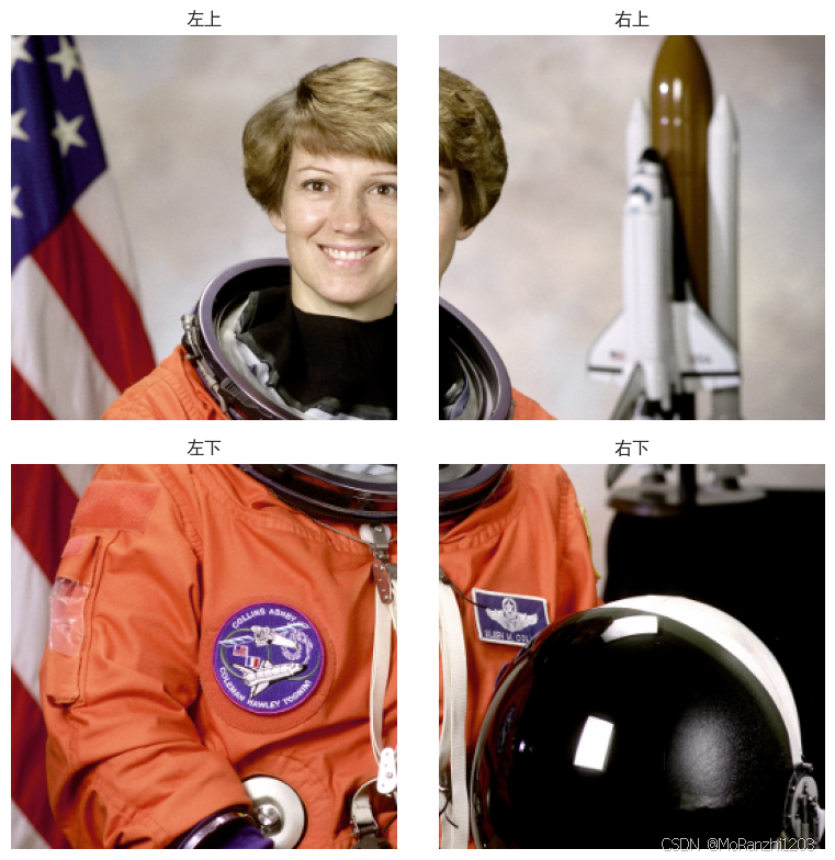 从空间划分角度看,这种操作可以理解为把原图定义域划分为若干互不重叠或按规则排列的子区域,再分别提取每一个子区域对应的图像内容。若以四分块为例,则可以写成: