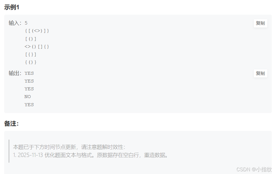 这道题要注意的点是,括号嵌套顺序以及括号能否相互匹配。我们可以将每个括号转化为数字,并且这个数字是按照正括号嵌套顺序由大到小4 ~ 1,反括号相反-4 ~ -1。那么我们就可以巧妙利用栈来完成这道题:首先我们输入这个字符串并遍历它,首先转化为数字,然后判断数字是否大于0,如果大于0并且栈不空且数字大于栈定元素,说明括号嵌套顺序不对,是不合法的,就不用往下判断了,否则将num入栈;如果数字小于0,并且栈非空且数字的相反数不等于栈顶,则括号有误,不合法,否则如果相同则直接删除栈顶元素。最终如果栈空并且没有不合法的情况输出YES否则输出NO.