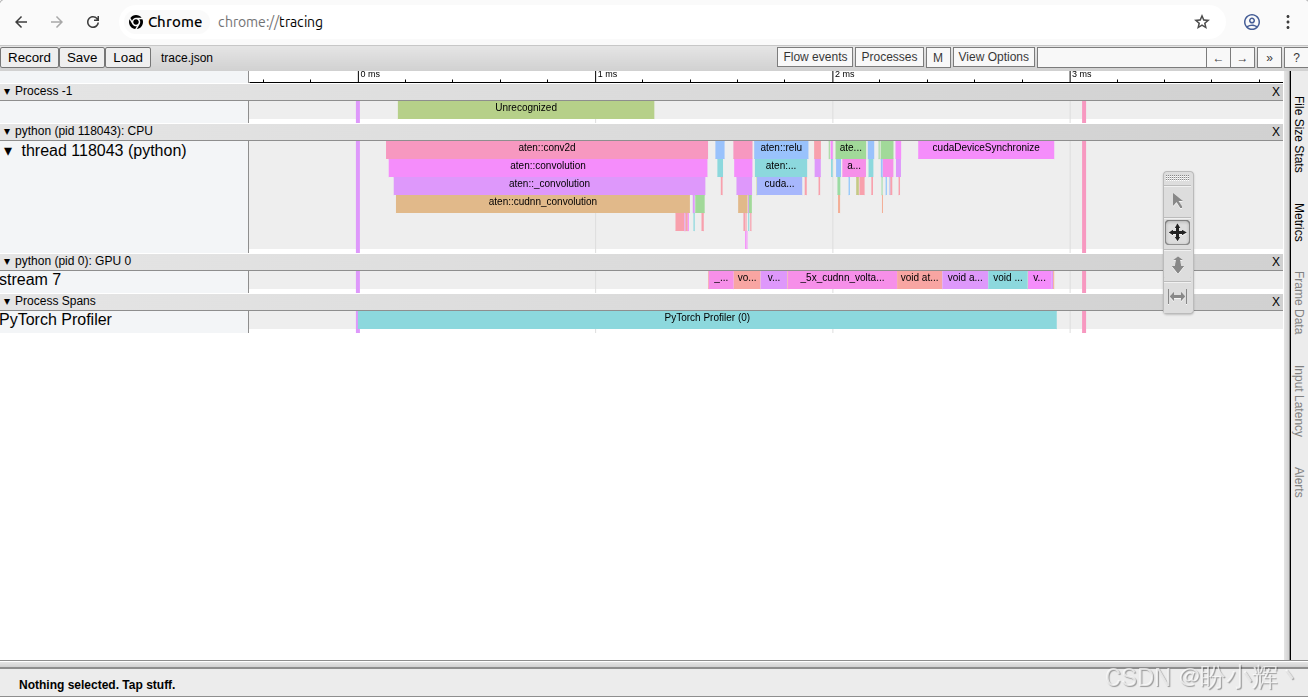 PyTorch Profiler 允许我们将分析结果保存为 trace.json 文件,可以在 Google Chrome 中打开并以图表形式进行可视化。将模型和输入数据加载到 GPU 后,我们只需要执行以下操作: