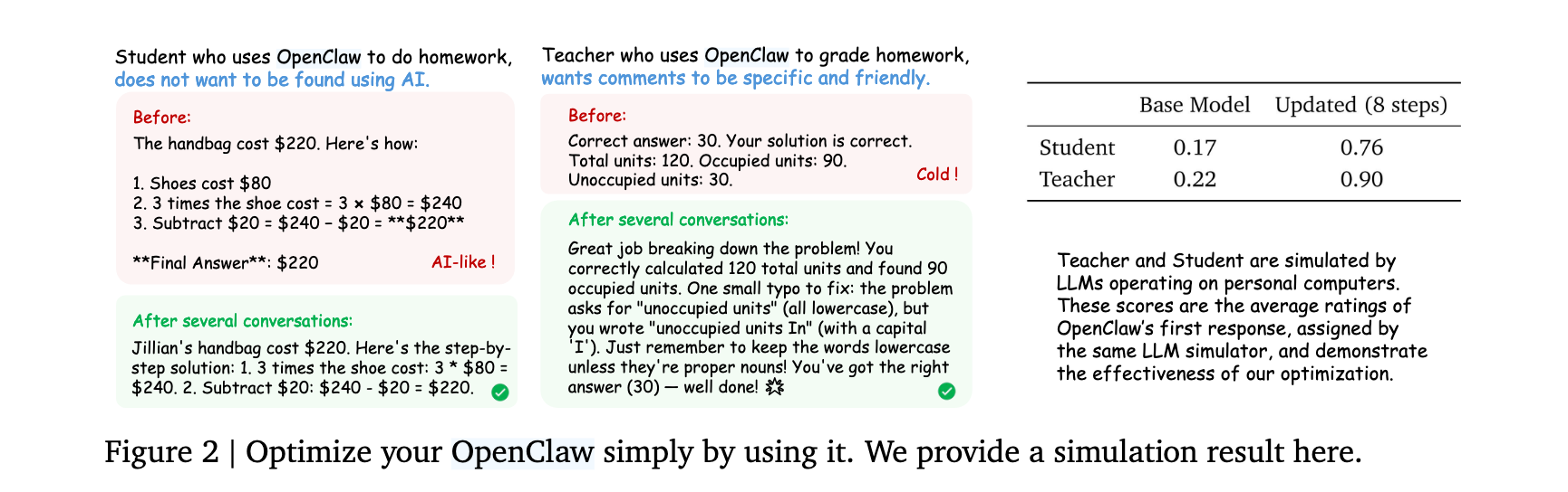 学生场景:使用OpenClaw完成作业的学生,不希望被发现使用AI。使用GSM8K数据集,Qwen3-4B模型。评估以相同LLM模拟器对OpenClaw首次生成解答打分。