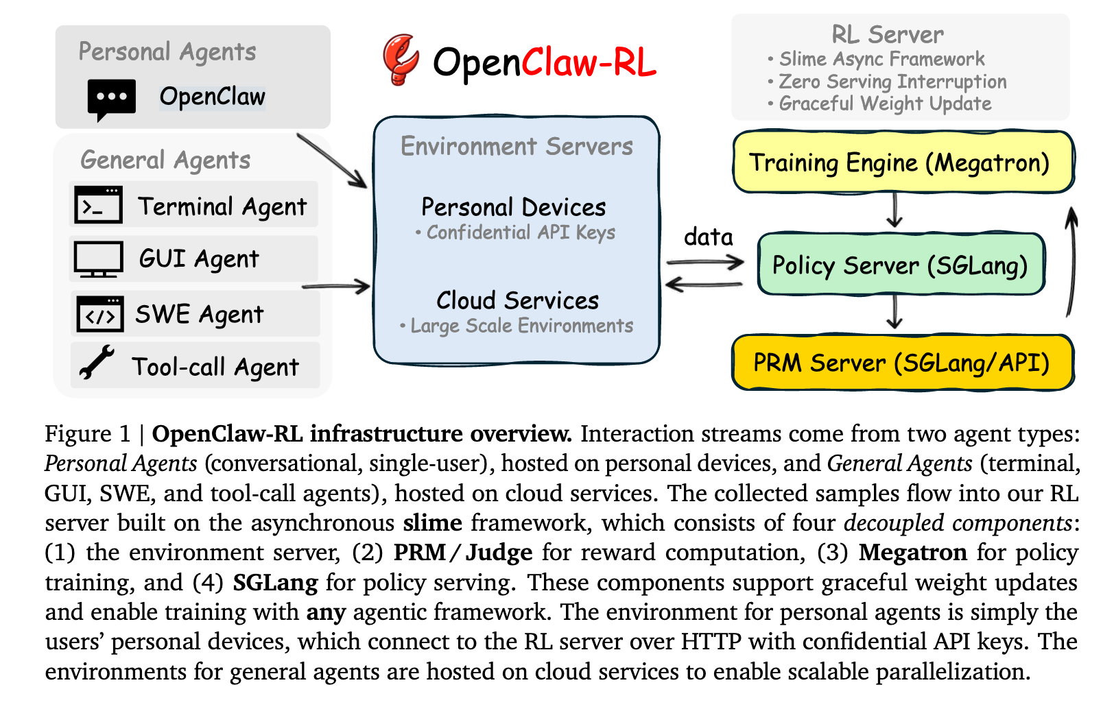 核心架构原则是完全解耦。策略服务、环境托管、PRM评判、策略训练作为四个独立异步循环运行,彼此零阻塞依赖。这使得从实时异构交互流持续训练变得可行:无需暂停或批量任何流以适配其他组件的调度。