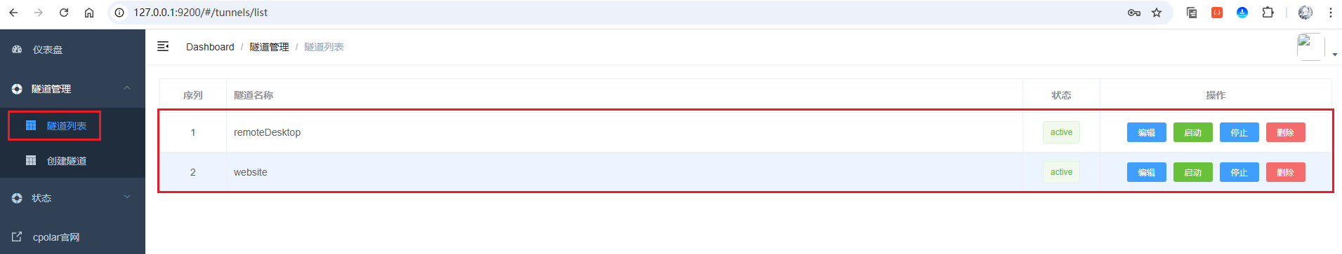 然后点击左侧菜单栏的隧道管理,展开进入隧道列表页面,页面下默认会有 2 个隧道: