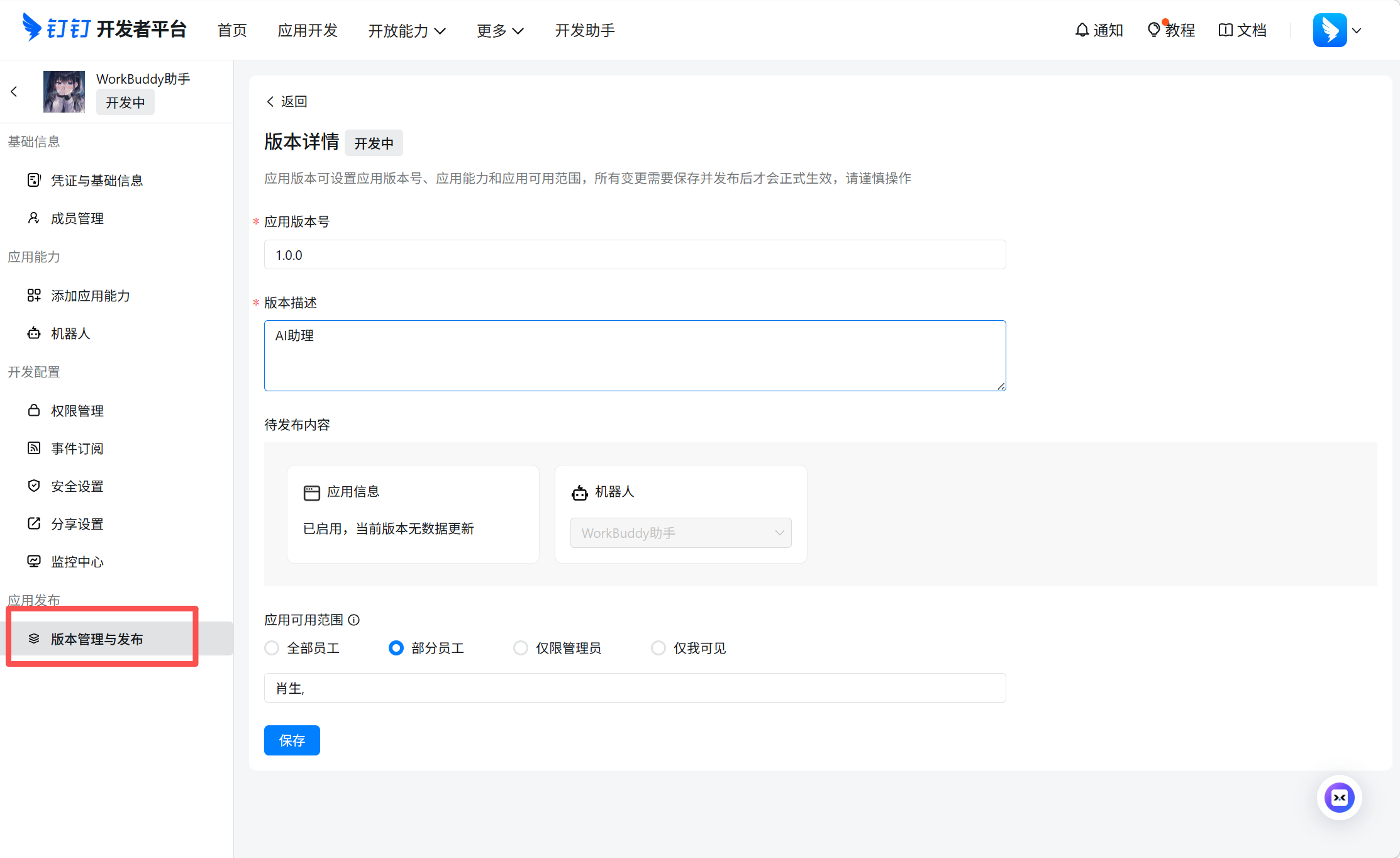 设置可见范围:点击「可见范围」旁边的「添加」,勾选哪些员工、部门或标签可以用这个机器人。这一步很重要,免得所有人都来"骚扰"它。