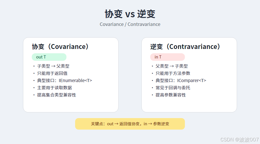 在 .NET 中,协变(Covariance) 和 逆变(Contravariance) 是泛型类型参数的一种类型转换机制,用来提高代码的灵活性。它们主要用于 接口和委托的泛型类型参数。