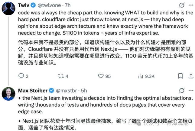 Cloudflare 曝出重磅技术成果:团队仅用一周时间,依托 AI 模型完成 React 全栈框架 Next.js 的重构,打造出基于 Vite 的替代框架 vinext,全程仅耗费 1100 美元的 AI token 成本,这一成果也被 Cloudflare CTO 称作 "Next.js 的解放日"。vinext 可无缝替换 Next.js,一条命令即可部署至 Cloudflare Workers,还在性能上实现大幅突破,成为 AI 赋能大型工程开发的里程碑案例。