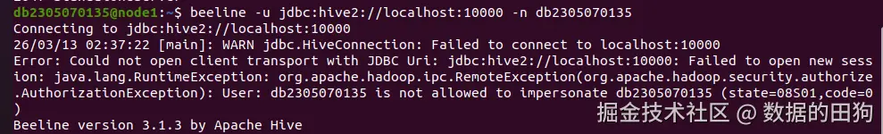 ✅ 成功标志:进入 beeline 交互界面,不再报 AuthorizationException,可执行 show databases;。 ✅执行成功结果:
