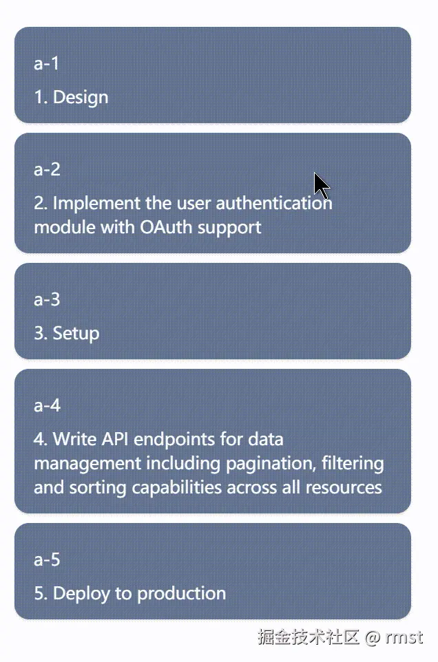 我们的列表有 5 个由内容决定高度的项目,核心思路是通过 transform 的 translateY 属性来控制每个项目的位置而不是直接操作 DOM 的顺序。