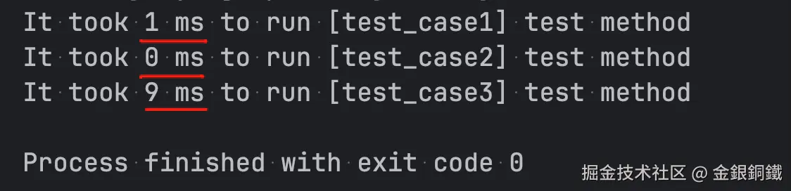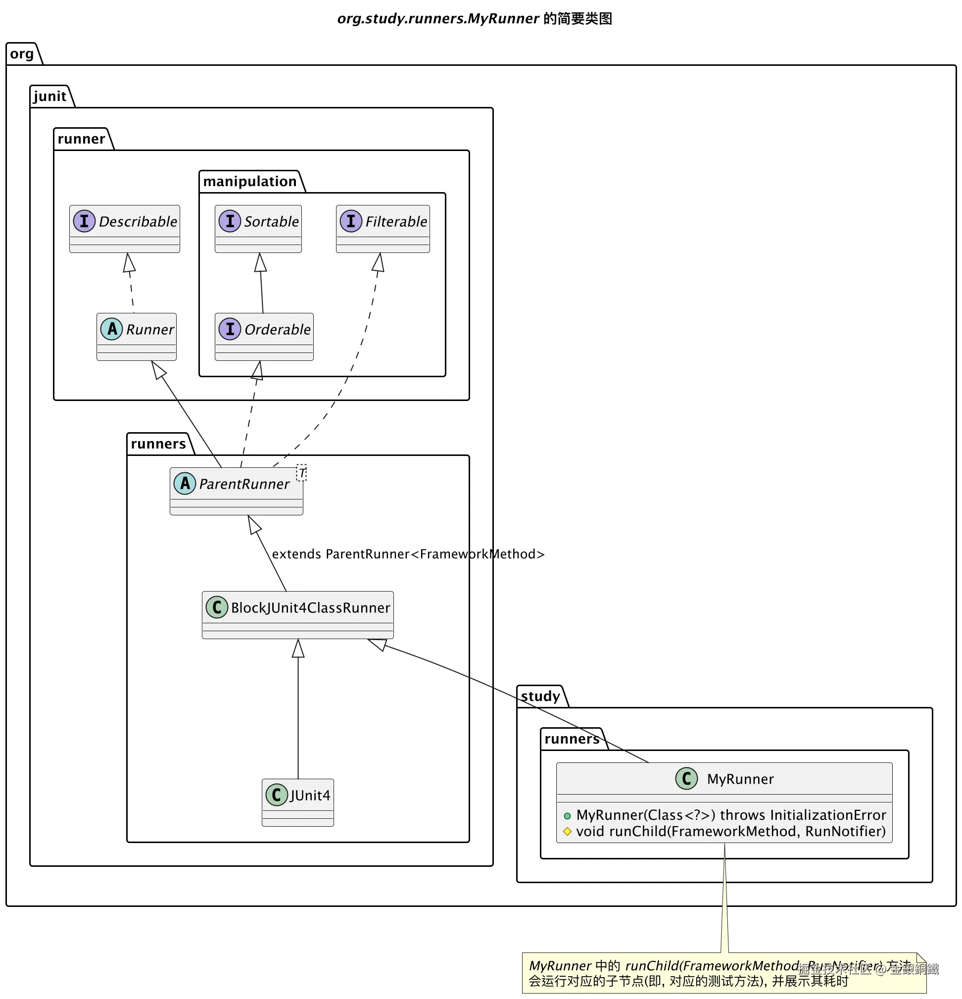 如果我们想统计每个测试方法的耗时,一个方案是实现一个专门的 <math xmlns="http://www.w3.org/1998/Math/MathML"> Runner \text{Runner} </math>Runner 来完成这个逻辑。由于 <math xmlns="http://www.w3.org/1998/Math/MathML"> org.junit.runners.JUnit4 \text{org.junit.runners.JUnit4} </math>org.junit.runners.JUnit4 是 final class,我们无法继承它。但是我们可以继承它的父类,即 <math xmlns="http://www.w3.org/1998/Math/MathML"> org.junit.runners.BlockJUnit4ClassRunner \text{org.junit.runners.BlockJUnit4ClassRunner} </math>org.junit.runners.BlockJUnit4ClassRunner。下一小节会展示项目中的代码。