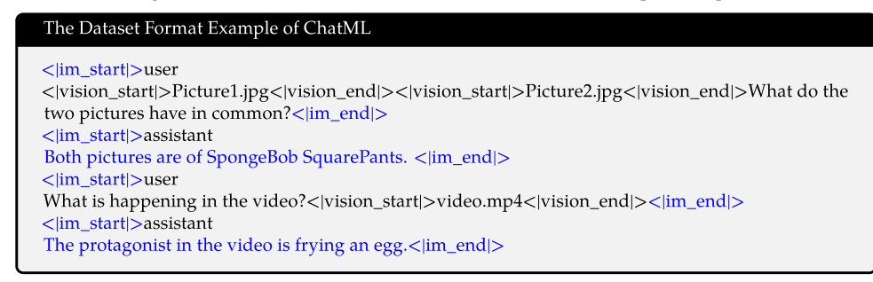 对话数据 :如下图所示,蓝色内容部分是训练时需要监督的部分,每段对话用<|im_start|>和<|im_end|>包裹。