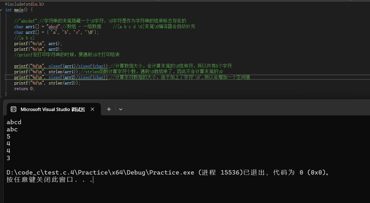 使用双引号括起来的一串字符就被称为字符串,如:"abcdef",就是一个字符串。末尾还隐藏一个 \0 的转义字符, \0 是字符串的结束标志。我们可以看到, arr2 字符数组在打印的时候,打印了 a 、 b 、 c 后还打印了一些随机值,这就是因为 arr2 在末尾的地方没有 \0 字符作为结束标志,在打印的时候没有停止,strlen() 计算字符串长度的时候,遇到 \0 的时候就自动停止了。