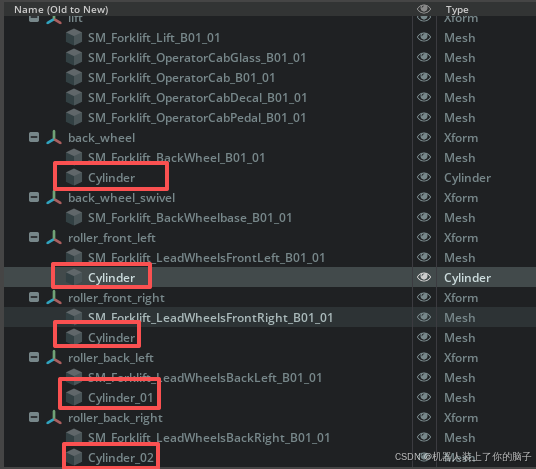 (4)将这些圆柱体拖动到各自车轮的Xform下,并将它们在所有轴上的变换(Transform)值与模型对齐,这将使圆柱体轴线与Xform轴线完全对齐。