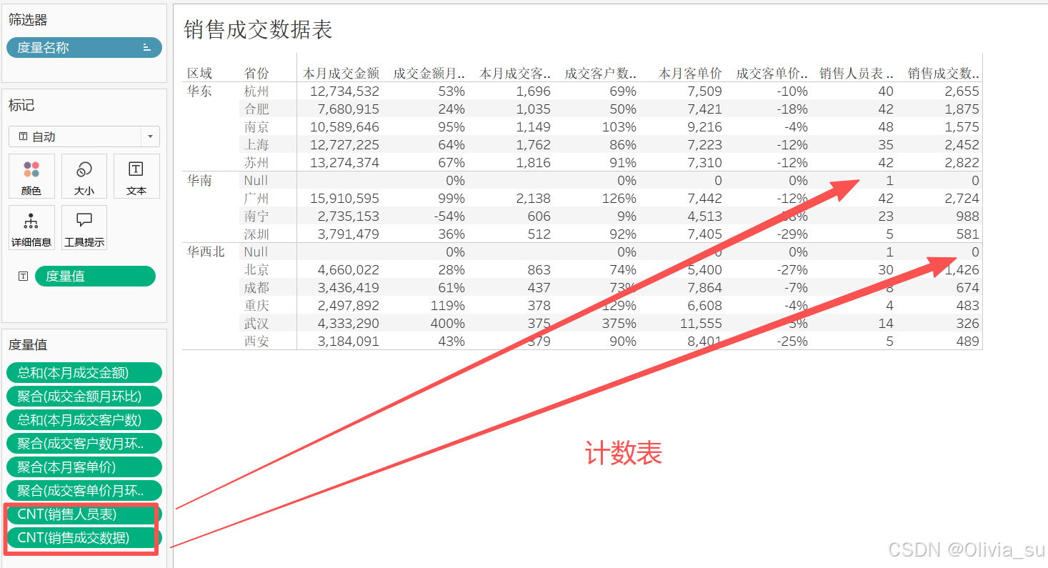 (6)计数表拖入,发现销售成交表有出现0