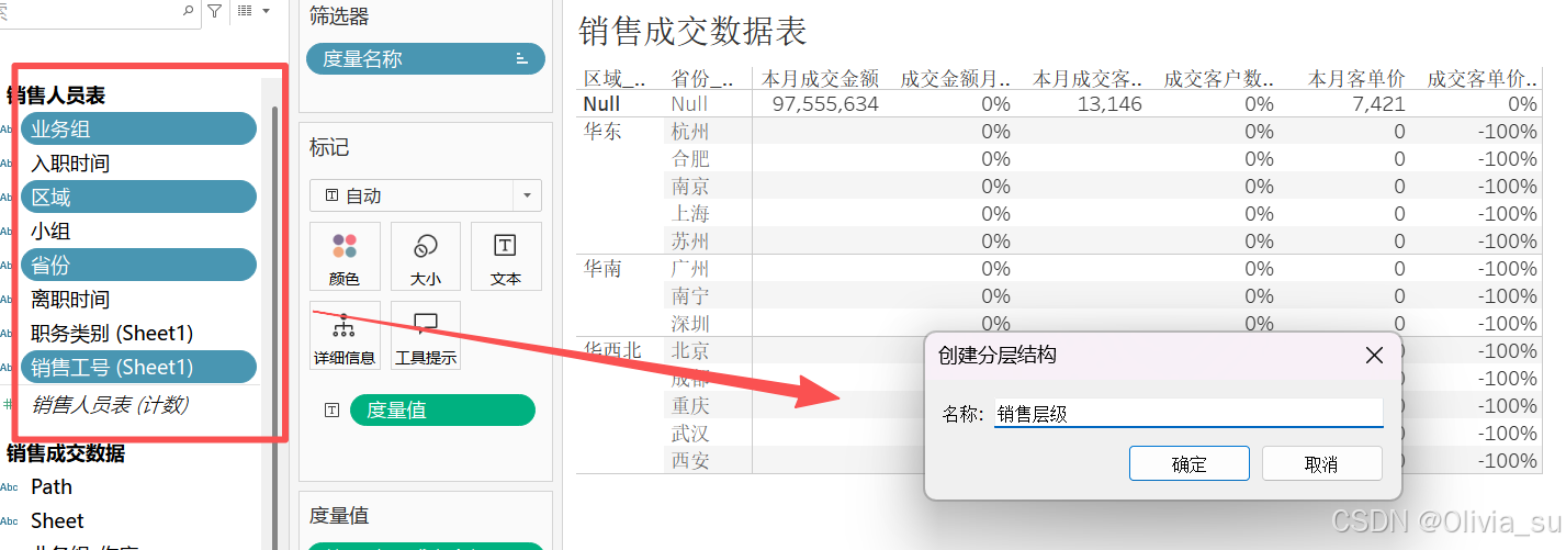 (3)重命名销售人员表的一些字段,使得和之前的字段一致。创建业务组字段。并将业务组区域省份工号创建一个分层结构