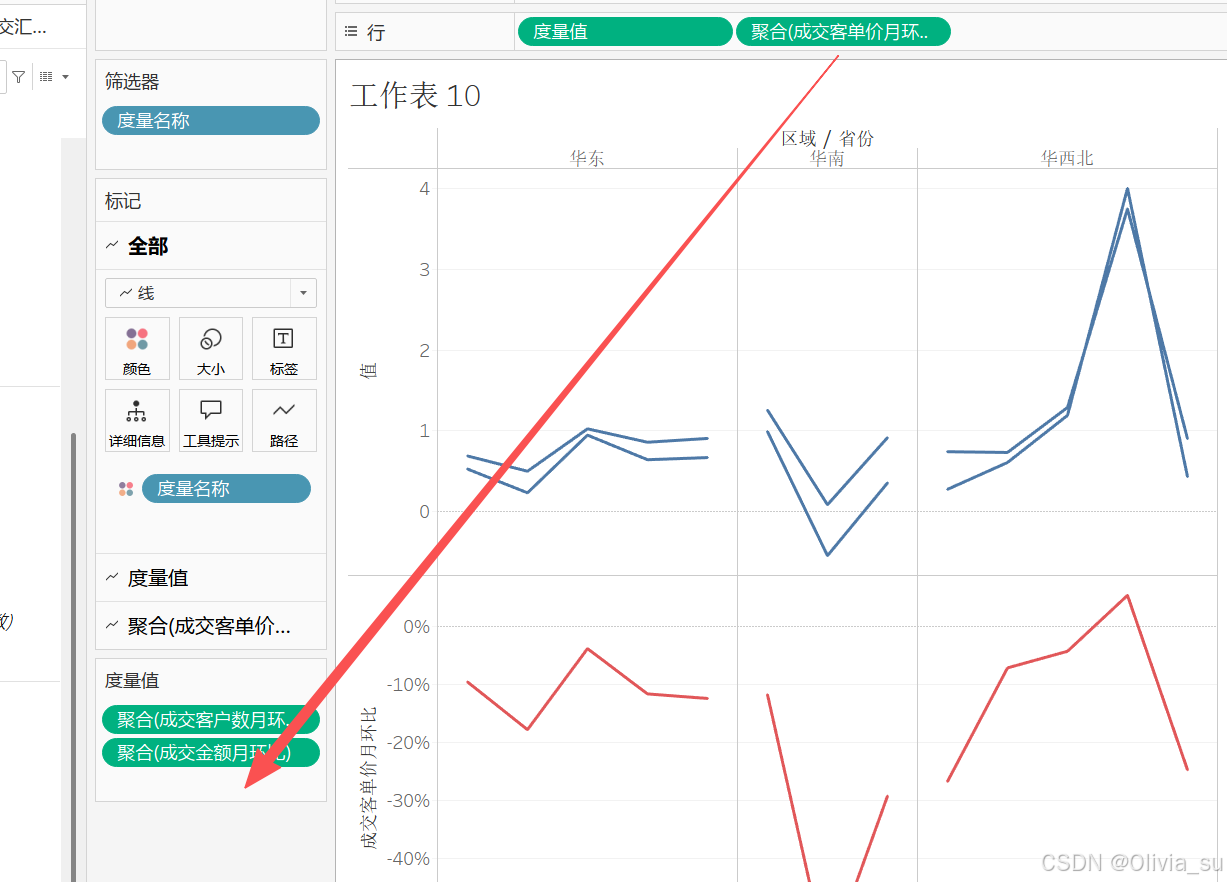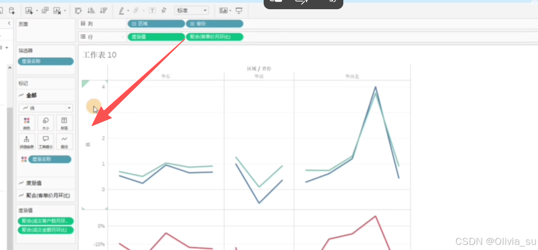 (2)按照区域,拆分折线图,将区域拖到颜色上