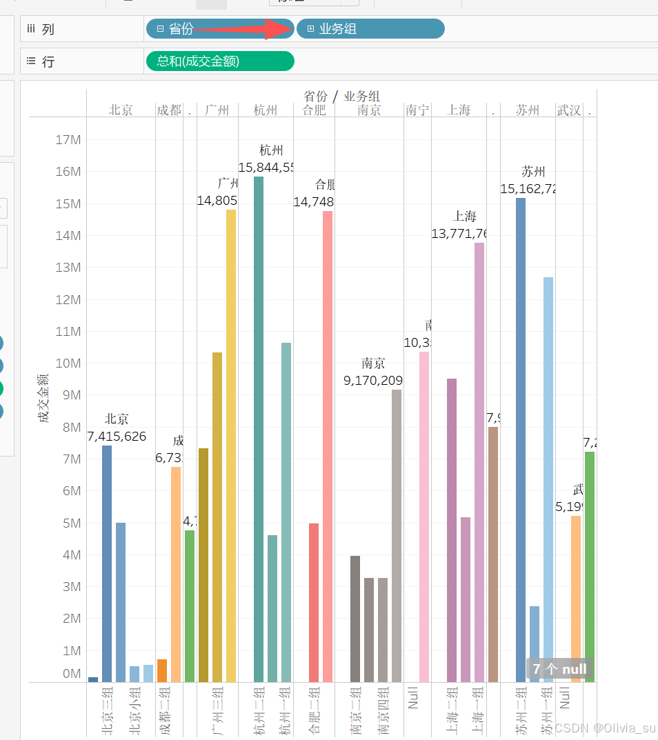 堆积柱状图,行代表金额,列代表每个省份,从省份那里点+,出现业务组,就是在省份基础上,对业务组进行划分;