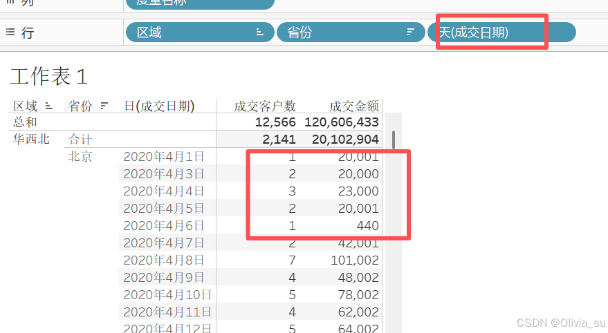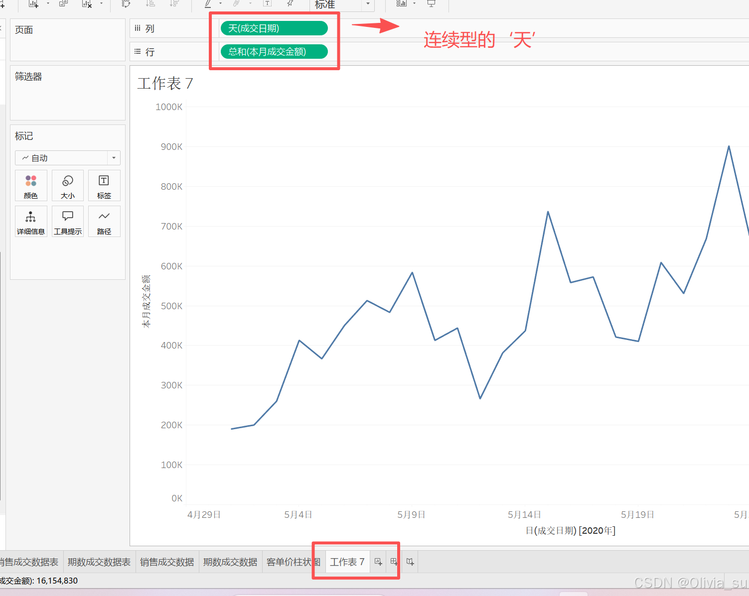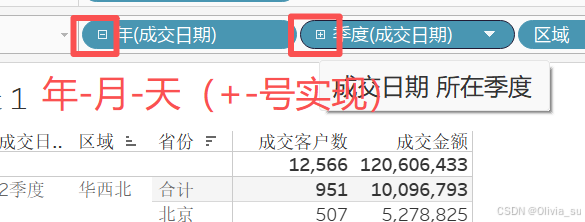成交日期拖动到行,是蓝色,它默认年作为划分依据;而将他修改为天,自动就变成了绿色,就变成了连续型的数据格式,此时再将其数据修改为离散,背景颜色变回蓝色,且下方的图转变为数字。