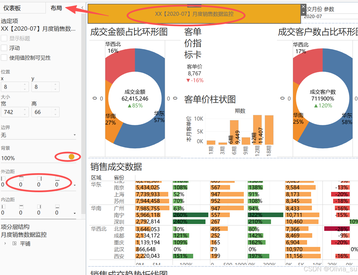 设置格式为百分比,度量值中拖动本月成交金额,置于交叉表的最左侧数据