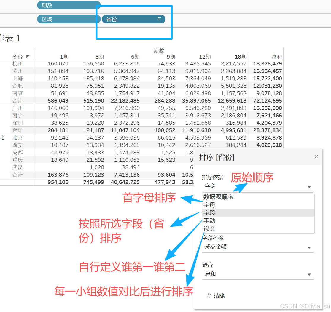 要按照什么条件进行排序,比如要按照区域-省份下的成交金额进行排序,就在行-省份那里右键选择排序