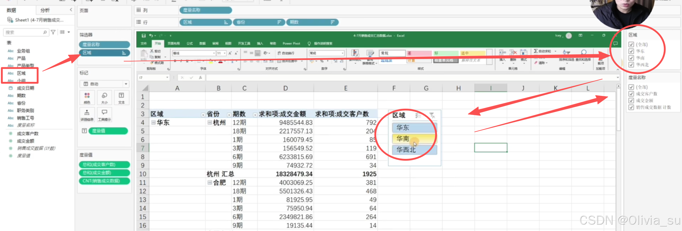 任意一个图表中把区域拖入筛选器,应用于所有数据中