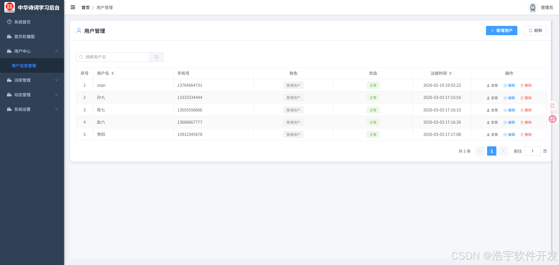词库管理模块是系统的核心功能之一,支持诗词的增删改查操作。