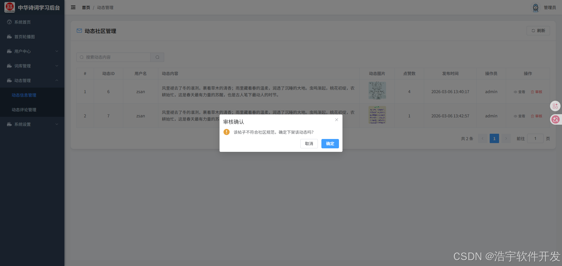 中华诗词学习后台管理系统是一个基于Vue 3 + TypeScript + Element Plus开发的现代化后台管理系统,旨在为用户提供一个功能完善、界面美观的诗词学习管理平台。该系统包含多个功能模块,支持诗词管理、动态社区、评论管理等核心功能。