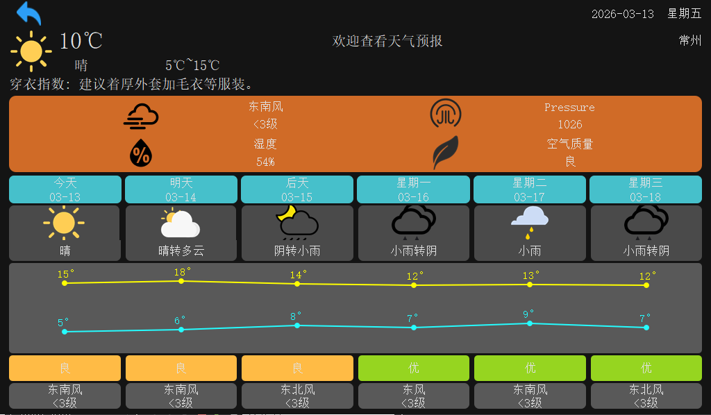 本项目中的天气预报模块基于 Qt Widgets 实现,界面由 Weather 窗口负责展示当前天气概况和未来一段时间的天气信息。模块通过网络请求或本地模拟数据获取气象信息,然后在界面上以图标、温度、天气描述等形式进行直观展示。借助 Qt 的信号槽机制,界面可以在定时器触发或用户手动刷新时自动更新天气数据,并在主界面中以简要形式做概览展示,在独立的天气页面中呈现更详细的信息。