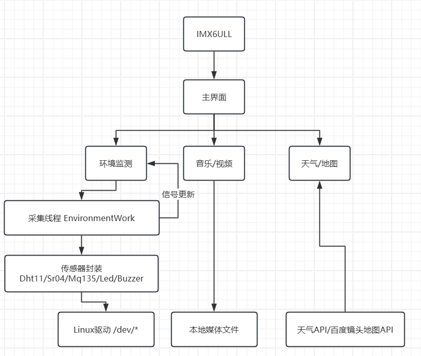 - 环境监测、多媒体播放等模块内部再拆分为:UI 层(QWidget)、逻辑层(工作线程/控制器对象)、硬件/数据访问层(设备封装类或多媒体引擎)。