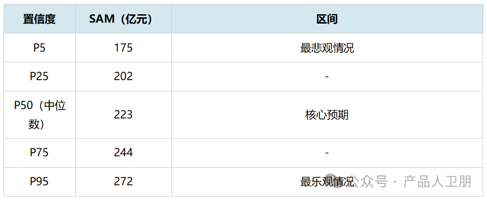 90%置信区间为175-272亿元,中位数223亿元与测算值222.5亿元高度一致。