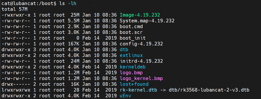 Image-4.19.232是 Linux 内核镜像,它后面要被 U-Boot 加载到内存里面。rk-kernel.dtb是一个软链接,它指向 U-Boot 真正会加载到内存里面的dtb文件,前面我说过,我通常会把编译好的dtb文件拷贝到板子的/boot/dtb目录下,众所周知同一目录下不能出现两个文件名相同的文件,所以这个新编译好的dtb文件就会覆盖掉旧的dtb文件,从而在启动阶段被 U-Boot 加载到内存。dtb/是存放二进制设备树文件的目录,包含多个板型的设备树文件,根据rk-kernel.dtb这个软链接的指向,决定 U-Boot 会加载哪个dtb文件。这也是这里软链接设计的精妙之处,有了这个软链接,我们完全可以将rk-kernel.dtb这个软链接名硬编码进 U-Boot ,这样只需要改变这个软链接的指向就可以切换 U-Boot 加载的设备树,而不需要修改 U-Boot 并编译那么麻烦。boot.cmd是 U-Boot 脚本源文件,也就是启动流程的源代码,我们后面会分析它。boot.scr是boot.cmd编译后的文件,U-Boot 实际加载的就是它。initrd-4.19.232是初始内存文件系统,是一个临时的根文件系统。