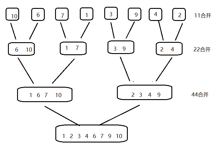 1 6 7 10和2 3 4 9→ 继续比排头,最终得到1 2 3 4 6 7 9 10