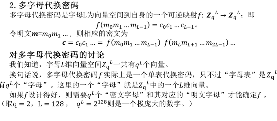对于多项式代换密码,只要密文中含有min{𝑡+1,𝑞}个不同的字母(对应明文中也含有min{𝑡+1,𝑞} 个不同的字母),则密钥[k0,... kt]被确定。